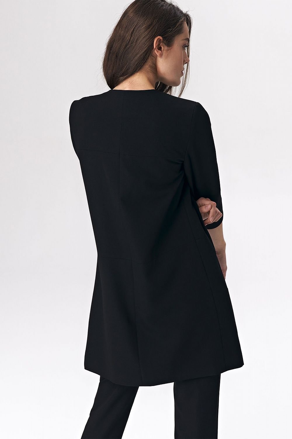 Die schwarze, lange Damenjacke ist eine großartige Ergänzung für ein weiches Büro-Styling. Es passt sowohl zu einem Kleid als auch zu einer Hose. Angenehmes Material, mit einem Hauch von Viskose, bietet hohen Tragekomfort.