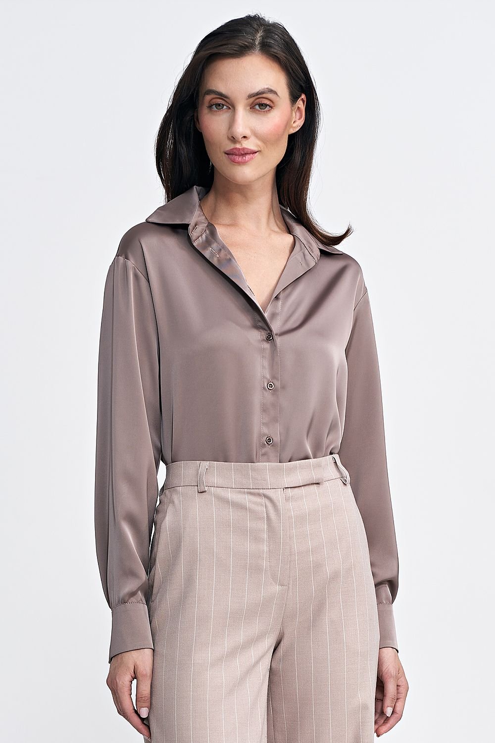 Körper mit regulärem Schnitt, aus einem Material mit satiniertem Effekt gefertigt, das Eleganz und subtilen Glanz verleiht. Es hat einen klassischen Kragen und lange Ärmel mit Manschetten, was dem Ganzen einen zeitlosen Stil verleiht. Die Knopfleiste vorne und die Druckknöpfe im Schritt sorgen für Komfort und einfaches Tragen. Der untere Teil, die Unterhose, ist aus elastischem Material gefertigt, was eine perfekte Passform und den ganzen Tag Komfort garantiert. Dieses Body vereint klassisches Design mit moderner Verarbeitung und schafft ein universelles Kleidungsstück.